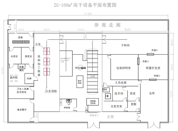 集抽真空与加热干燥功能为一体的的密闭容器,物料的升华干燥过程在干燥仓内完成的,物料是放在干燥室内搁板上的不锈钢托盘内的,按每平方托盘面积8~12公斤的比例装料,每一层搁板上都有一个可供测量物料温度的探头,用以监测整个冻干过程中的物料温度。